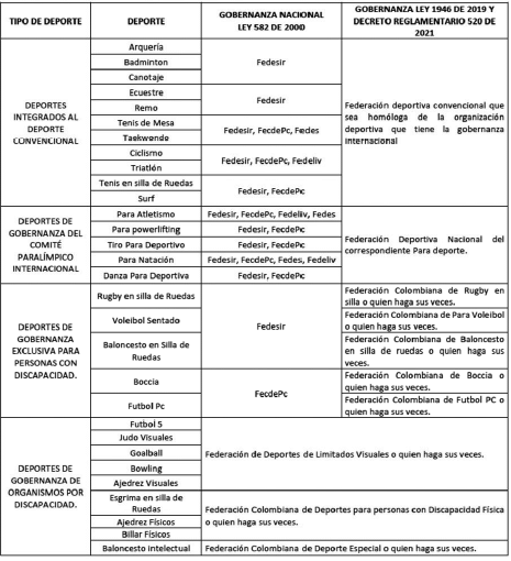 Que el artículo 2.9.2.1. del mencionado decreto 520 de 2021 señala: “Organización. Los organismos deportivos se organizarán por deporte o por discapacidad de acuerdo con los lineamientos del Comité Paralímpico Internacional, en conjunto con las Federaciones Internacionales por Deporte y las Organizaciones internacionales de deporte para personas con discapacidad”.