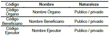 Clasificador de los Órganos del Sistema General de Regalías, entidades que ejecutan recursos de Administración del SGR, del Sistema de Seguimiento, Evaluación y Control (SSEC) y de inversión del SGR y beneficiarios de Asignaciones Directas. Identifica para cada uno de los Órganos, beneficiarios de Asignaciones Directas y ejecutores de recursos del Sistema General de Regalías su código dentro del Sistema General de Regalías, nombre y naturaleza si es privada o pública.