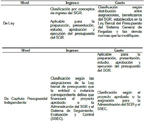 - Nivel de Ley. Es el utilizado en la Ley Bienal de Presupuesto del Sistema General de Regalías aprobada por el Congreso de la República y las demás normas que la adicionan, modifiquen o sustituyan.