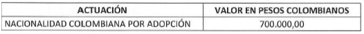 ARTÍCULO 9o. TARIFAS PARA EL TRÁMITE DE NATURALIZACIÓN. El costo del trámite para la solicitud de nacionalidad colombiana por adopción se mantendrá en el siguiente valor: