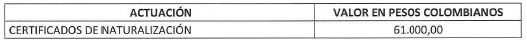 a) En el territorio nacional: La tarifa para el trámite del certificado de naturalización es: