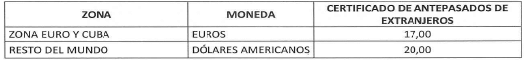 b) En el exterior: Las tarifas del certificado de no objeción a la permanencia en el exterior quedarán así: