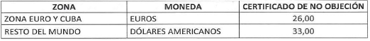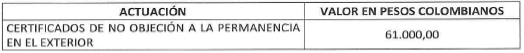a) En el territorio nacional: La tarifa del certificado de no objeción a la permanencia en el exterior, es: