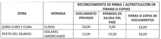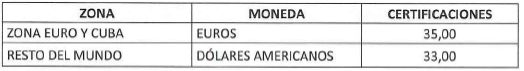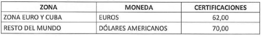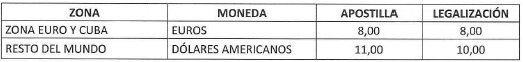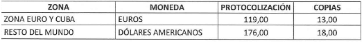 b) En el exterior: Las tarifas de la apostilla o legalización de documentos en el exterior quedarán así: