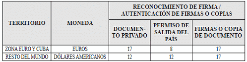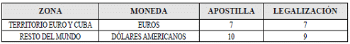 b) En el exterior: La tarifa por concepto de la apostilla o legalización de documentos en el exterior, es:
