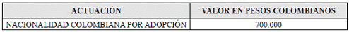 ARTÍCULO 9o. TARIFA PARA EL TRÁMITE DE NACIONALIDAD COLOMBIANA POR ADOPCIÓN. <Resolución derogada por el artículo de la Resolución 9593 de 2022> La tarifa para el trámite de nacionalidad colombiana por adopción, es: