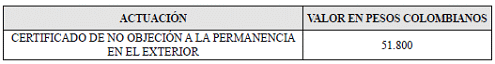 a) En el territorio nacional: La tarifa para el trámite del certificado de no objeción a la permanencia en el exterior, solicitados en el territorio nacional, es: