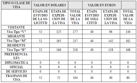 h) El valor a pagar en la etapa de expedición de una visa Tipo “V” en categoría de turista o para tránsito aeroportuario será de cuarenta (40) Euros si es solicitada eri territorio Euro y Cuba, y de cincuenta y dos (52) Dólares de los Estados Unidos de América si es solicitada en el resto del mundo;