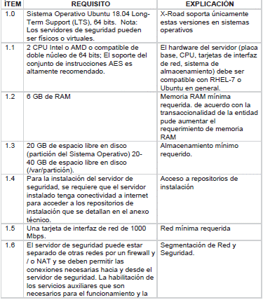 Actualmente, los servidores de seguridad se instalan en el Sistema Operativo Linux Ubuntu 18.04 y Red Hat, y la comunicación entre ellos se lleva a cabo a través de los Puertos 80, 443 y 5500. Varios servidores de X-Road se pueden instalar en una misma máquina a través de contenedores o máquinas virtuales, por ejemplo, para ambientes de prueba, sin embargo, se debe considerar el impacto en el rendimiento.