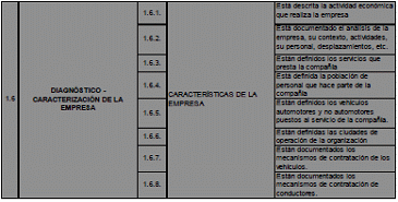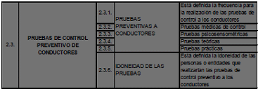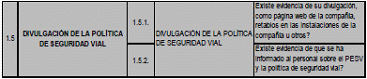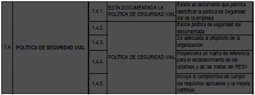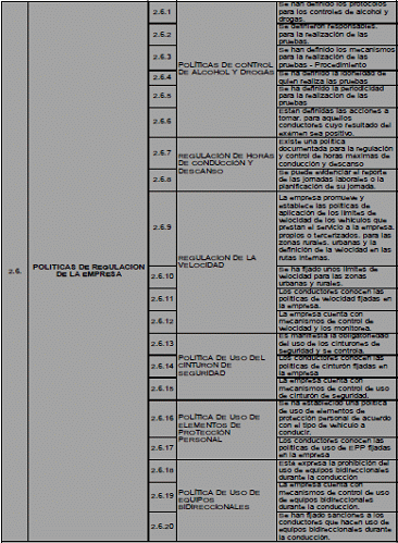 | 2.6.16 | POLÍTICA DE USO DE ELEMENTOS DE PROTECCIÓN PERSONAL | Se ha establecido una política de uso de elementos de protección personal de acuerdo con el tipo de vehículo a conducir. | 1 | 0 | ||||||||||