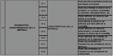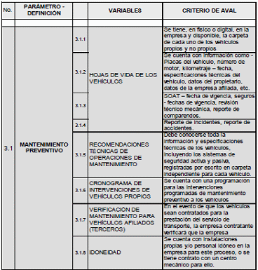 | 3.1.8 | IDONEIDAD | Se cuenta con instalaciones propias y/o personal idóneo en la empresa para este proceso, o se tiene contrato con un centro mecánico para ello. | 6,25 | 0 | ||||||||||
