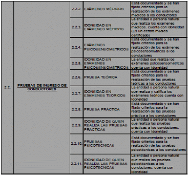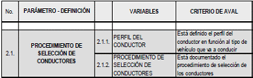 | 2.5. | CONTROL DE DO- CUMENTACION DE CONDUCTORES | 2.5.1 | INFORMACIÓN DE LOS CONDUCTORES | La empresa documenta y registra un mínimo de información de cada uno de los conductores, de acuerdo con lo definido en la Resolución 1565. | 10 | 1,5 | 0 | |||||||