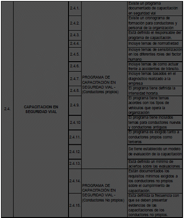 | 2.4.14. | PROGRAMA DE CAPACITACIÓN EN SEGURIDAD VIAL (Conductores No propios) | Están documentados los requisitos mínimos exigidos a los conductores no propios sobre el cumplimiento de capacita-ción. | 1,4 | 0 | ||||||||||