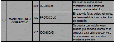 | 3.2 | 3.2.1 | REGISTRO | Se llevan registros de los mantenimientos correctivos realizados a los vehículos | 30 | 10 | 0 | ||||||||