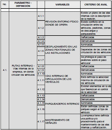 | 4.1. | RUTAS INTERNAS -Vías internas de la em- presa, en donde circulan los vehículos | 4.1.1 | REVISIÓN ENTORNO FÍSICO DONDE SE OPERA | Existe un plano de las vías in-ternas con la descripción de la revisión. | 35 | 2,06 | 0 | |||||||