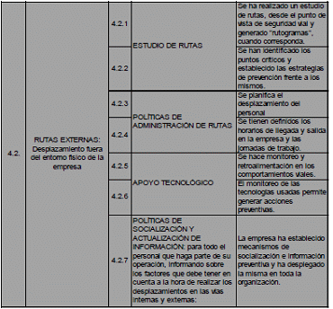 | 4.2. | RUTAS EXTERNAS: Desplazamiento fuera del entorno fisico de la empresa | 4.2.1 ESTUDIO DE RUTAS Se han identificado los puntos críticos y establecido las estrategias de prevención frente a los mismos. | Se ha realizado un estudio de rutas, desde el punto de vista de seguridad vial y generado “rutogramas”, cuando corresponda. | 65 | 9,28 | 0 | ||||||||