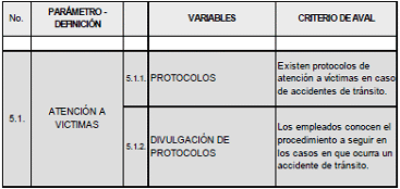 | 5.1. | ATENCIÓN A VICTIMAS 512. | 5.1.1. | PROTOCOLOS | Existen protocolos de atención a víctimas en caso de accidentes de tránsito. | 20 | 10 | 0 | |||||||