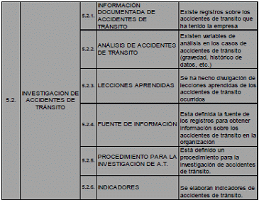 | 5.2.5. | PROCEDIMIENTO PARA LA INVESTIGA- CIÓN DE A.T. | Está definido un procedimiento para la investigación de accidentes de tránsito. | 13,33 | 0 | ||||||||||