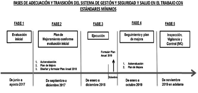 | 5. | Inspección, Vigilancia y Control | Fase de verificación del cumplimiento de la normatividad vigente sobre el Sistema de Gestión de SST. | La efectúa el Ministerio del Trabajo conforme a los Estándares Mínimos establecidos en la presente resolución. | De noviembre de 2019 en adelante |