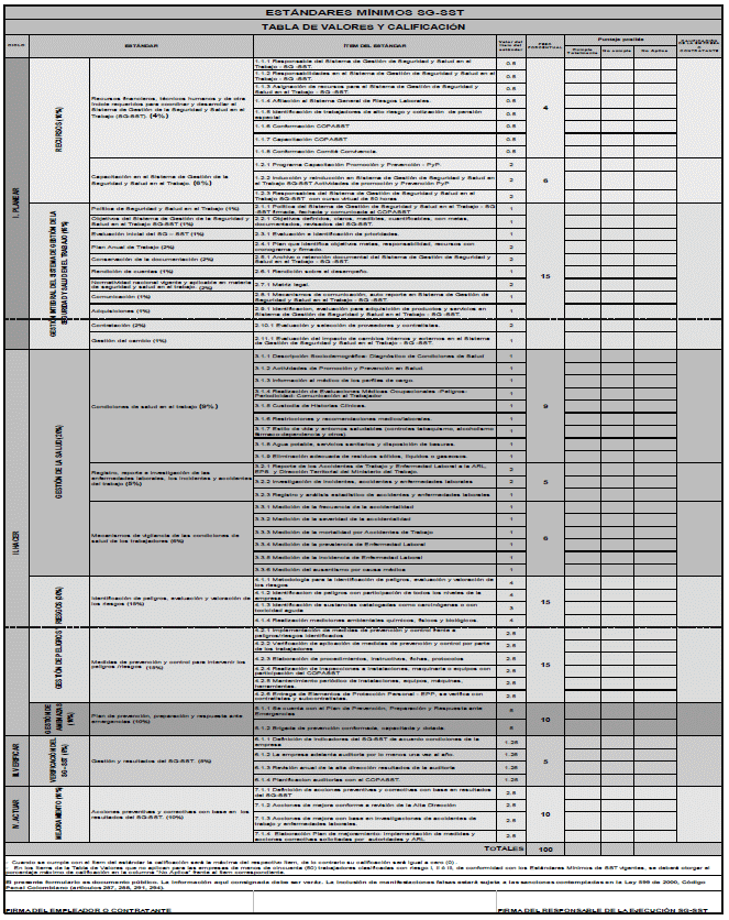 1. Aplicar la autoevaluación conforme a la Tabla de Valores y Calificación de los Estándares Mínimos del Sistema de Gestión de SST, mediante el diligenciamiento del formulario de evaluación establecido en el artículo 27 de la presente resolución.