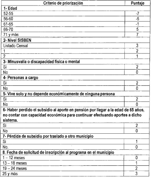 Como resultado de ello, se han definido criterios de priorización de beneficiarios, siendo requisito Indispensable para todas las personas que resulten favorecidos del subsidio económico haber sido sometidos a la metodología de priorización propuesta. Dando prioridad en la asignación del subsidio a quienes obtengan el puntaje más alto, a partir de este procedimiento se configura la base de datos de potenciales beneficiarios, en la cual se encuentran registrados los adultos mayores que esperan ser beneficiados con el programa; del orden establecido en esta base se determina el ingreso de los nuevos beneficiarios bien sea por novedades generadas por las causales de retiro o por ampliación de cobertura.