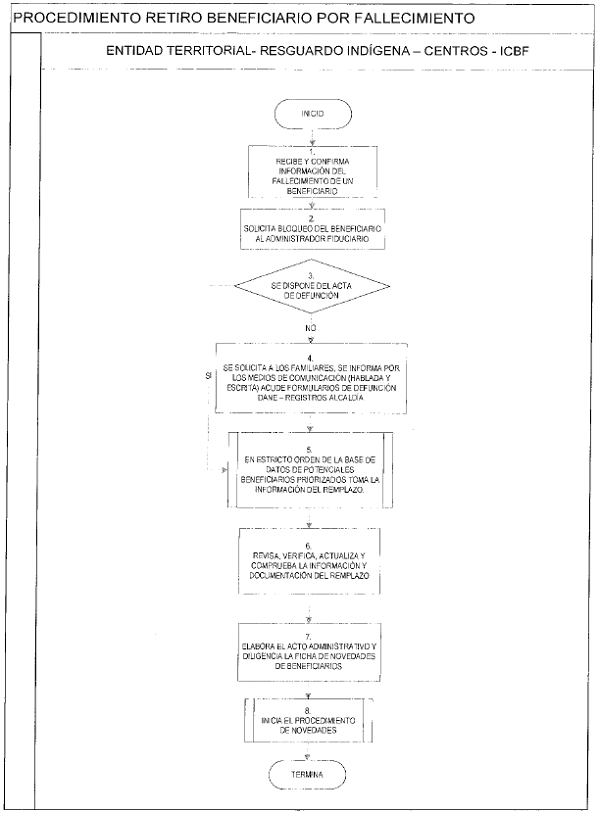 Cuando el coordinador del programa en el municipio, el resguardo o el ICBF reciben información del fallecimiento de un beneficiario del programa y no disponen del registro civil de función. Inicialmente y de conformidad con la información de los beneficiarios se les solicita a los familiares el respectivo registro y de manera inmediata debe proceder a solicitar al administrador fiduciario el bloqueo del beneficiario.