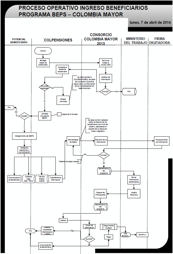 | ALCANCE | El procedimiento inicia con la definición del proceso de identificación de posibles beneficiarios BEPS y posibles beneficiarios del Programa de Protección Social al Adulto Mayor hoy Colombia Mayor. Y termina con la definición de aceptación en el ingreso como beneficiario y programación de pagos de subsidios, por parte del administrador fiduciario. | ||||