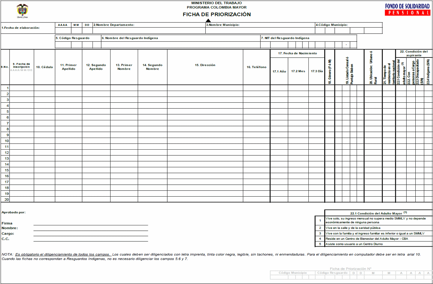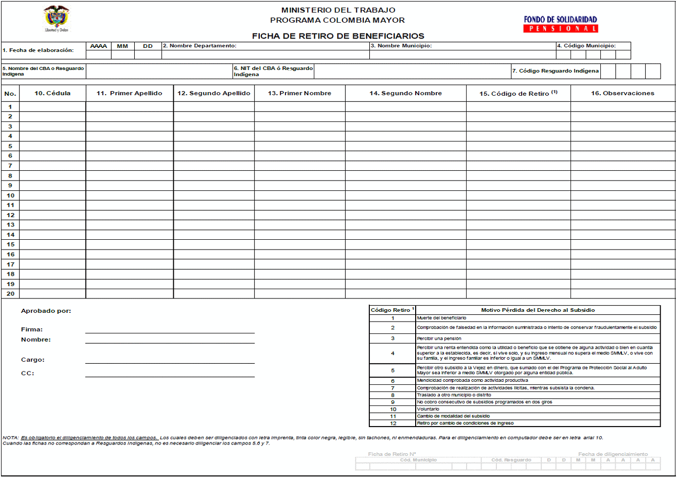 14 | Procesamiento de información para validación de ingreso al Programa de Protección Social al Adulto Mayor hoy Colombia Mayor. | Administrador Fiduciario | Validación Base de datos y documentos digitalizados | ||