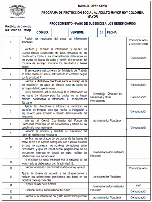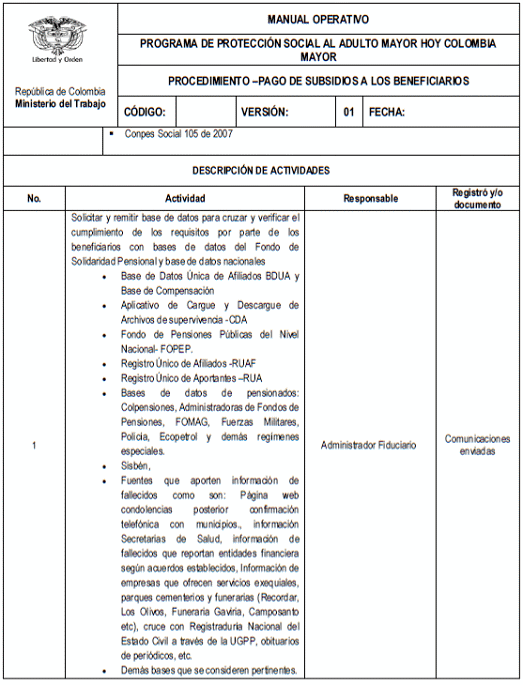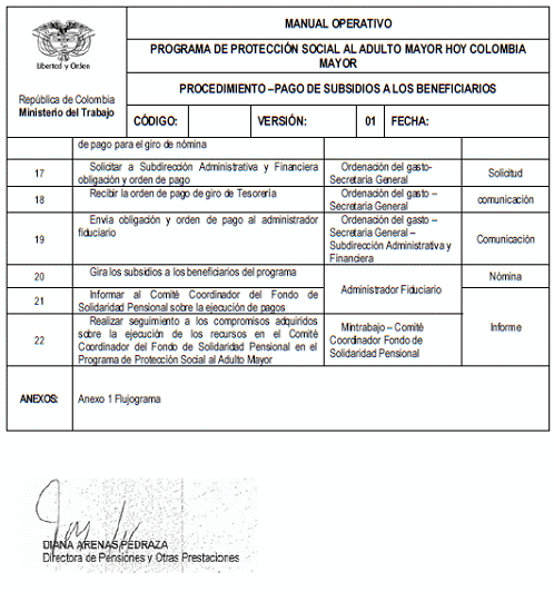 En cumplimiento de lo previsto en el articulo 2o de la Resolución 1370 del 2 de mayo de 2013, con la cual se actualizó el Manual Operativo del Programa de Protección Social al Adulto Mayor, hoy Colombia Mayor, que previo que los ajustes que requiera el Manual Operativo se harán a través de anexo técnico elaborado por la Dirección de Pensiones y Otras Prestaciones del Ministerio del Trabajo y con el objetivo de poder modificar la periodicidad del pago del subsidio económico del Programa Colombia Mayor, se hace necesario actualizar algunos apartes del Manual Operativo.