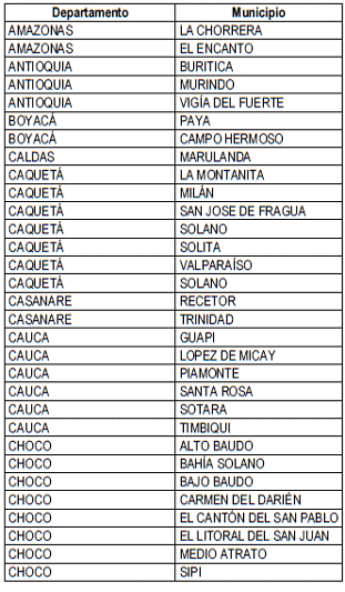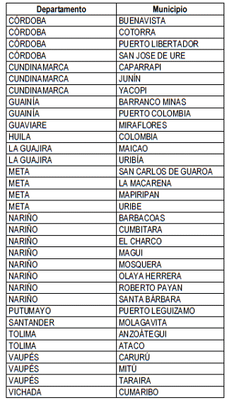 La siguiente lista de municipio hace referencia al Parágrafo Primero de la Cláusula Cuarta del Contrato de Encargo Fiduciario No 604 de 2018, donde se encuentran Indicados los municipios que se encuentran excluidos del pago mensual de subsidios