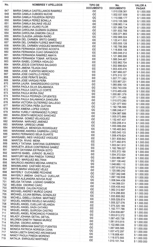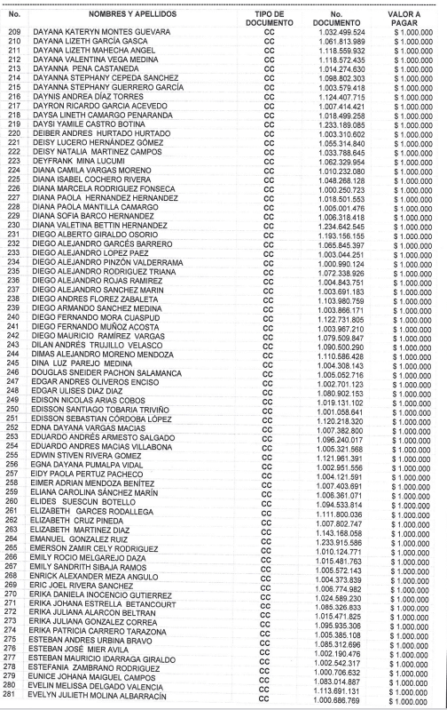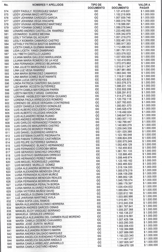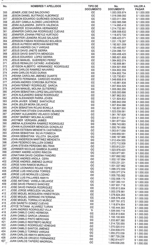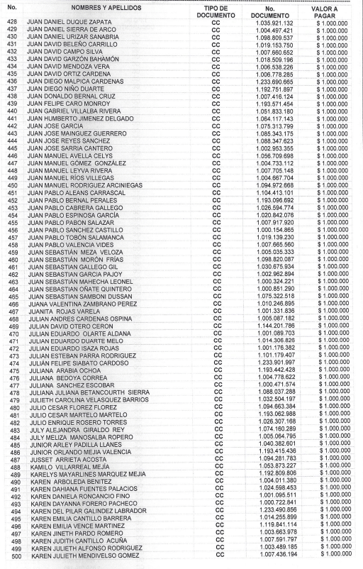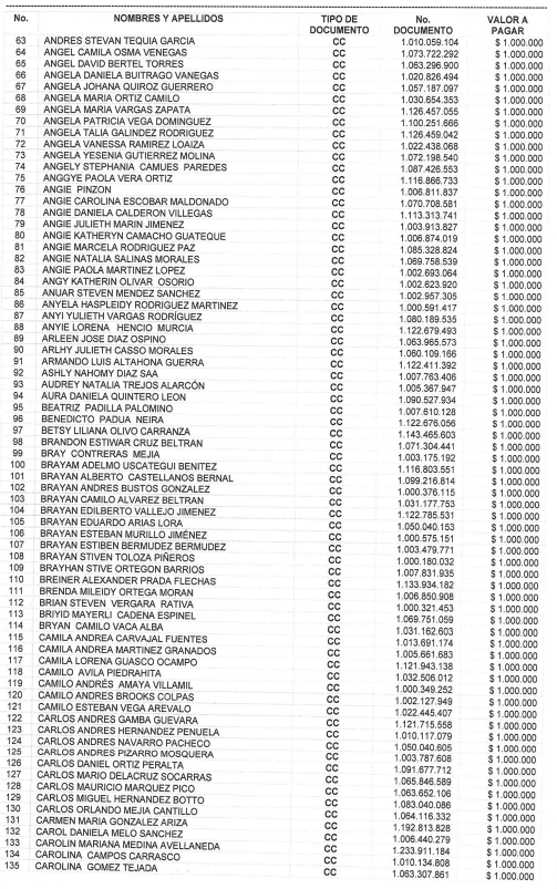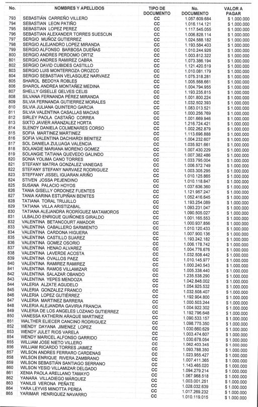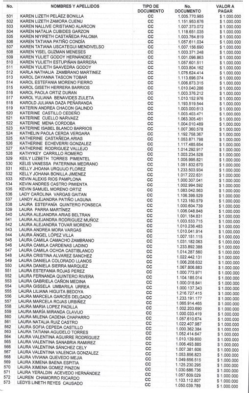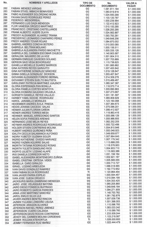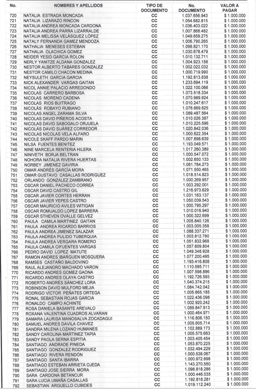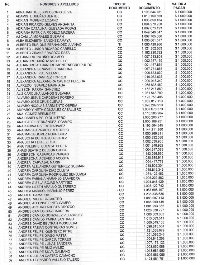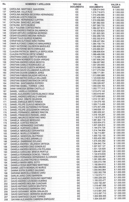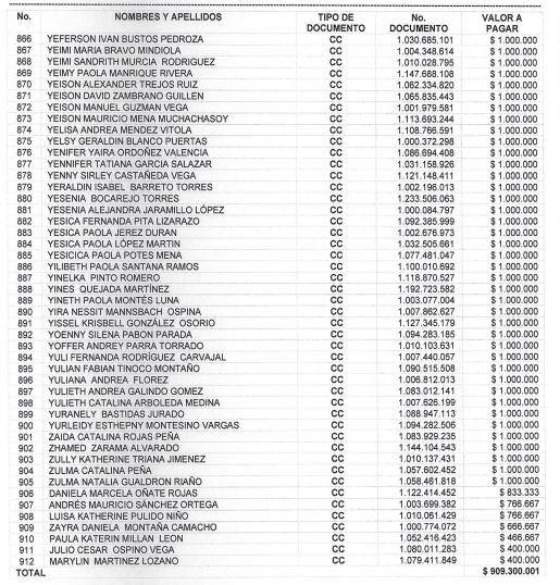 - NOVECIENTOS CINCO (905) estudiantes, que realizaron prácticas laborales durante el mes de agosto de 2022, son autorizados para el pago de UN MILLÓN DE PESOS M/CTE ($ 1.000.000), para cada uno de ellos. En total, el valor autorizado para el pago a este grupo de estudiantes asciende a NOVECIENTOS CINCO MILLONES DE PESOS ($ 905.000.000).