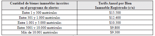 ARTÍCULO 21. ALERTAS TEMPRANAS. <Resolución derogada por el artículo 26 de la Resolución 2436 de 2021> La solicitud de información por parte del usuario de ser alertado mensualmente vía correo electrónico y/o mensaje de texto vía teléfono móvil y en el momento en que se presente una solicitud de registro sobre su inmueble, de los actos de registro a los que sea sometido el(los) bien(es) inmueble(s) de su propiedad, salvo las excepciones reglamentadas por la entidad, causarán derechos por la suma de quince mil quinientos pesos ($15.500) anuales, por cada uno de los bienes inmuebles sobre el que se solicite la inscripción en el programa de alertas.