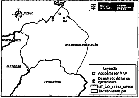 Que, mediante Oficio radicado interno número DTCF1-20210069 de fecha 29 de enero de 2021, el DAICMA OFI21-00011295/IDM 13020000, indicó que la información de MAP, MUSE (riesgo por campos minados) por eventos de Minas Antipersona o Municiones Sin Explosionar, es concordante con la suministrada al área catastral de la Unidad de Restitución de Tierras, actualizada periódicamente por el Grupo de Gestión en Prevención, Protección y Seguridad (GPPS), relacionando un mapa en el cual se evidencia a continuación, por lo que se extrajo la información del Informe Técnico de Micro realizado por la Unidad así: 4 eventos por desminado militar en operaciones y 5 eventos por Accidente por MAP2.