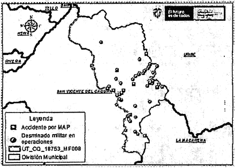 Que mediante Oficio radicado interno No. DTCF1-20210069 de fecha 29 de enero de 2021, el DAICMA OFI21-00011295/IDM 13020000, indicó que la información de MAP, MUSE (riesgo por campos minados), por eventos de Minas Anti Persona o Municiones Sin Explosionar, es concordante con la suministrada al área catastral de la Unidad de Restitución de Tierras, actualizada periódicamente por el Grupo de Gestión en Prevención, Protección y seguridad GPPS, relacionando un mapa en cual se evidencia a continuación, por lo que se extrajo la información del Informe Técnico de Microrealizado por la Unidad, así: eventos accidente por MAP: 21 y Desminado militar en operaciones: 662.