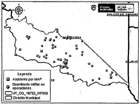 Que mediante Oficio radicado interno No. DTCF1-20210069 de fecha 29 de enero de 2021, el DAICMA OFI21-00011295/IDM 13020000, indicó que la información de MAP, MUSE (riesgo por campos minados) por eventos de Minas Anti Persona o Municiones Sin Explosionar, es concordante con la suministrada al área catastral de la Unidad de Restitución de Tierras, actualizada periódicamente por el Grupo de Gestión en Prevención, Protección y seguridad GPPS, relacionando un mapa en cual se evidencia a continuación, por lo que se extrajo la información del Informe Técnico de Microrrealizado por la Unidad, así: Eventos por accidente por MAP: 14 y Desminado militar en operaciones: 602.