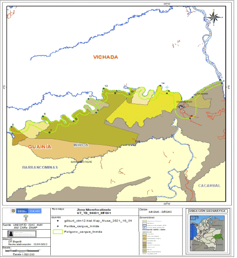 Debe tenerse en cuenta que la Dirección Territorial Bogotá de la Unidad, se ha propuesto microfocalizar un área geográfica el municipio de Inírida, que hacen parte del departamento de Guainía, cuya ubicación corresponde a un radio de 13 Km alrededor del casco urbano, la cual se encuentra representada en el mapa al que correspondió el número UT_TB_94001_MF001, el cual fue elaborado por la mencionada Dirección Territorial, forma parte de este acto administrativo, y cuenta con las siguientes coordenadas geográficas en grados, minutos y segundos (MAGNA-SIRGAS1) puntos extremos del área seleccionada, así:
