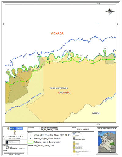 Debe tenerse en cuenta que la Dirección Territorial Bogotá de la Unidad, se ha propuesto microfocalizar un área geográfica el municipio de Barrancominas en un sector 2 km al lado del río Guaviare, representada en el mapa al que correspondió el número UT_TB_94343_ MF001, el cual fue elaborado por la mencionada Dirección Territorial, forma parte de este acto administrativo, y cuenta con las siguientes coordenadas geográficas en grados, minutos y segundos (MAGNA-SIRGAS1) puntos extremos del área seleccionada, así: