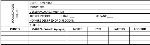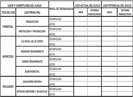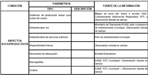 Para su análisis, se tomará la información válida bien sea de tipo cartográfico o estadístico, destacando la escala y fecha. Dicha información se complementará y ajustará con información a partir de la práctica con las visitas de campo, los resultados se registrarán de conformidad con los parámetros establecidos en el formato diseñado para tal efecto, como se identifica en la tabla 6, y será denominado Caracterización de los predios por sus parámetros socioproductivos.