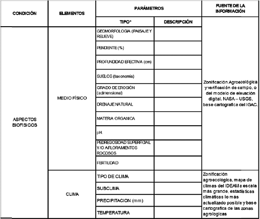 Para su análisis, se realizará el cruce con las diferentes fuentes institucionales que provean información válida, bien sea de tipo cartográfico o estadístico, detallando la escala y fecha de información. Los resultados se registraran de conformidad con los parámetros establecidos en el formato diseñado para el efecto, como se identifica en la tabla 5, y denominado caracterización biofísica de los predios por sus parámetros individuales.