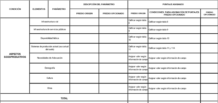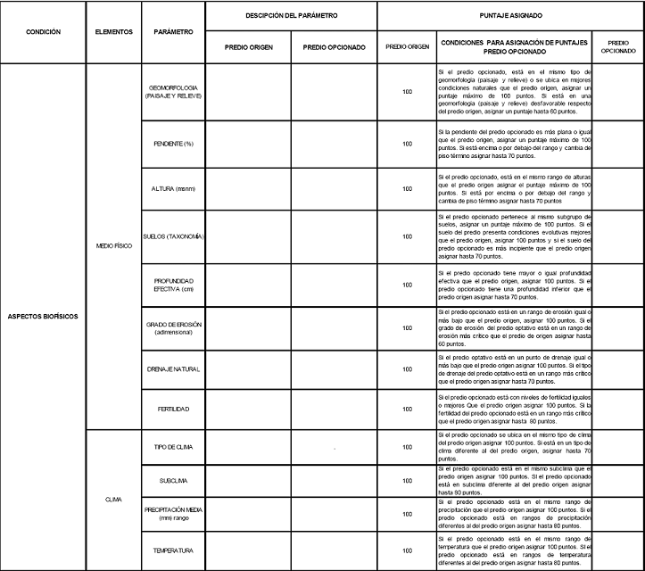 Predio Origen: Los parámetros medioambientales (biofísicos), siempre tendrán el valor de 100, puntos; en tanto que a los parámetros socioproductivos se les asignará el puntaje según los criterios establecidos en las tablas de control 8 a 11 A.
