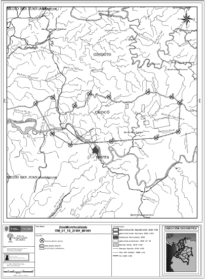 La Dirección Territorial Bogotá – Chocó de la Unidad, se ha propuesto microfocalizar un área geográfica del municipio de Nóvita que hace parte del departamento de Chocó, cuya ubicación se encuentra representada en el mapa al que correspondió el número UT-TB-270491_MF001 el cual fue elaborado por el área catastral de la mencionada Dirección Territorial, forma parte de este acto administrativo, y cuenta con las siguientes coordenadas geográficas en grados, minutos y segundos (MAGNA- SIRGAS1) puntos extremos del área seleccionada, así: