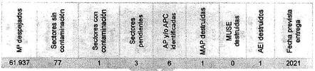 Que mediante Oficio No. 2021864000171151:MDN-COGFM-COEJC-SECEJ-JEMGF-COING-BRDEH-BIDEH2-AYU-29.25 de fecha 1° de febrero de 2021, el Batallón de Ingenieros de Desminado Humanitario No. 2 indicó que: “Municipio tipología I que en su totalidad fue asignado al BIDEH 2, en el mes de agosto de 2017 y a la fecha tiene los siguientes resultados:
