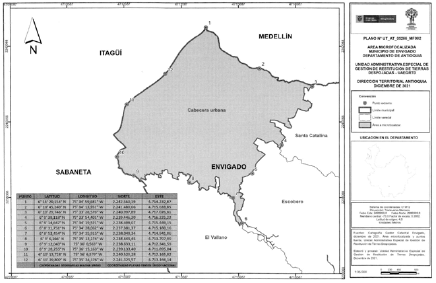 Que la Dirección Territorial Antioquia de la Unidad de Restitución de Tierras se propuso microfocalizar el perímetro de la Cabecera Urbana del municipio de Envigado, departamento de Antioquia, conforme con lo representado en el Mapa número UT_ AT_05266_MF-002, elaborado por esta Dirección Territorial, que forma parte integral del presente acto administrativo y que cuenta con las siguientes coordenadas geográficas en grados, minutos y segundos (MAGNA-SIRGAS1) puntos extremos del área seleccionada, así: