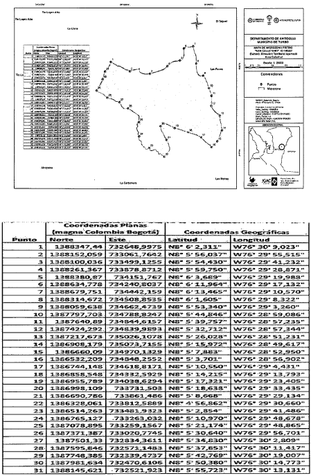 Primero. Microfocalizar del predio Hacienda San Calletano, en el Municipio de Turbo del departamento de Antioquia, el Corregimiento de Nueva Antioquia, Vereda Toribio Alto, tal y como se logra identificar en el Informe Técnico de Microfocalización, ID de microzona 1452, elaborado por esta Dirección Territorial, que es parte integral del presente acto administrativo, y que cuenta con las' coordenadas geográficas ilustradas en la parte considerativa del presente acto administrativo y que cuenta con las coordenadas geográficas en grados, minutos y segundos (MAGNA-SIRGAS22) relacionados en la parte considerativa.