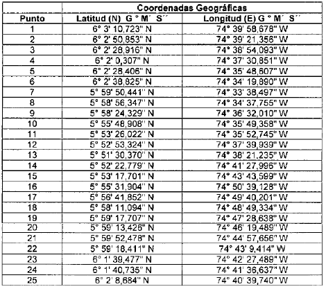| Punto 25 | 6° 2' 8,684” N | 74° 40' 39,740” W | 2.225.224,32 | 4.814.389,58 |