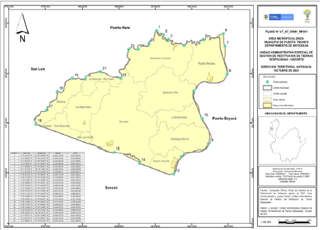 “Primero: Micro focalizar el municipio de Puerto Triunfo, Departamento de Antioquia, sus corregimientos Doradal, Estación Cocorná, Las Mercedes y Puerto Perales y las veredas catastralmente denominadas como: Alto del Pollo, Balsora, Doradal, Estación Cocorná, Estación Pita, La Esmeralda, La Estrella- Rioclaro, La Florida- Tres Ranchos, Las Mercedes, Puerto Perales, Puerto Triunfo y Santiago Berrío, polígono representado en el Plano No. UT_AT_05591_MF001, elaborado por el área catastral de esta Dirección Territorial, que hace parte integral del presente acto administrativo, teniendo en cuenta los siguientes sistemas de coordenadas planas “Único Origen Nacional” y sistema de coordenadas geográficas “Magna Sirgas”: