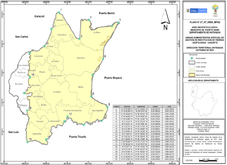 “Primero. Micro focalizar parte del municipio de Puerto Nare, Departamento de Antioquia, específicamente los corregimientos de La Sierra, La Pesca, y La Unión y las veredas catastralmente denominadas como: Canteras, Caño Seco, Cominales, El Oro, Hoyo Rico, La Arabia, La Clara, La Esmeralda, La Mina, La Patiño, La Unión, Las Angelitas, Los Delirios, Monte Cristo, Mulas, Peña Flor, Playas, Porvenir, Río Cocorná y Santa Rita, polígono representado en el Plano número UT_AT_05585_ MF002, elaborado por el área catastral de esta Dirección Territorial, que hace parte integral del presente acto administrativo, teniendo en cuenta los siguientes sistemas de coordenadas planas “Único Origen Nacional” y sistema de coordenadas geográficas “Magna Sirgas”:
