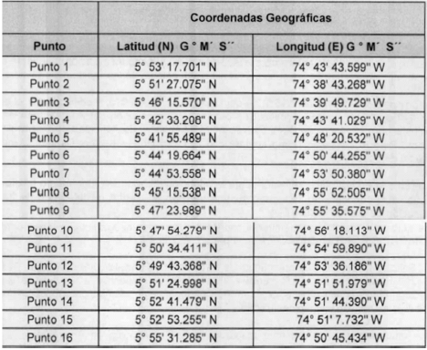 | Punto 15 | 5° 52' 53,255” N | 74° 51' 7,732” W | 2208229,860 | 4795026,862 |