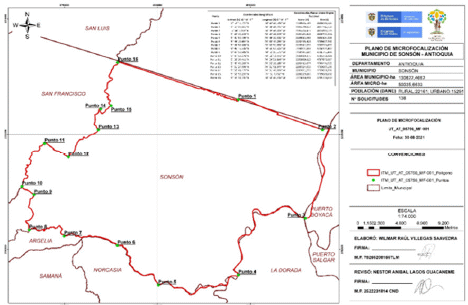 “Primero. Microfocalizar una parte del municipio de Sonsón en el departamento de Antioquia, específicamente los corregimientos La Danta y San Miguel, así como las veredas catastralmente identificadas como: Butantan, Jerusalem, La Danta, La Flor del Tesoro, La Hermosa, La Linda, La Mesa, La Paz San Francisco, Limones, Mulato Abajo, Mulato Alto, Parcelas, Piedras Blancas, San Antonio, San Miguel, San Rafael, Santa Rosa, Santo Domingo, polígono representado en el Plano número UT_ AT_05756_MF-001, elaborado por el área catastral de esta Dirección Territorial, que hace parte integral del presente acto administrativo, teniendo en cuenta los siguientes sistemas de coordenadas planas “Único Origen Nacional” y sistema de coordenadas geográficas “Magna Sirgas”: