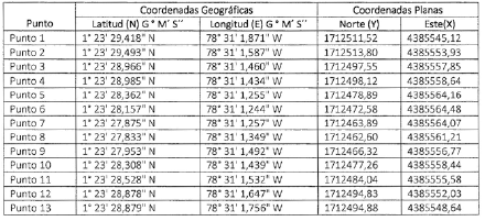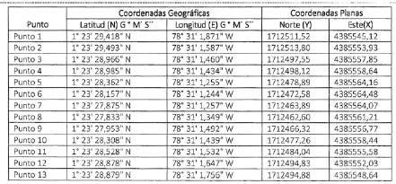 En atención a lo anterior, la Dirección Territorial Nariño de la Unidad de Restitución de Tierras, se propuso microfocalizar el área correspondiente a trescientos ochenta y nueve metros cuadrados (389 m2), ubicado en el corregimiento de Llorente del municipio de Tumaco, del departamento de Nariño conforme al plano del Informe de Microfocalización, elaborado por el Área Catastral de esta Dirección Territorial, que forma parte integral del presente acto administrativo y que cuenta con las siguientes coordenadas geográficas en grados, minutos y segundos (Magna-Sirgas11), puntos extremos del área seleccionada, así: